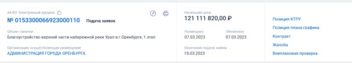В Оренбурге в 2023 году начнутся благоустройство верхней части набережной реки Урал. На сайте госзакупок объявлен аукцион на реализацию первого этапа. Начальная (максимальная) цена лота составляет 121 111 820 рублей.