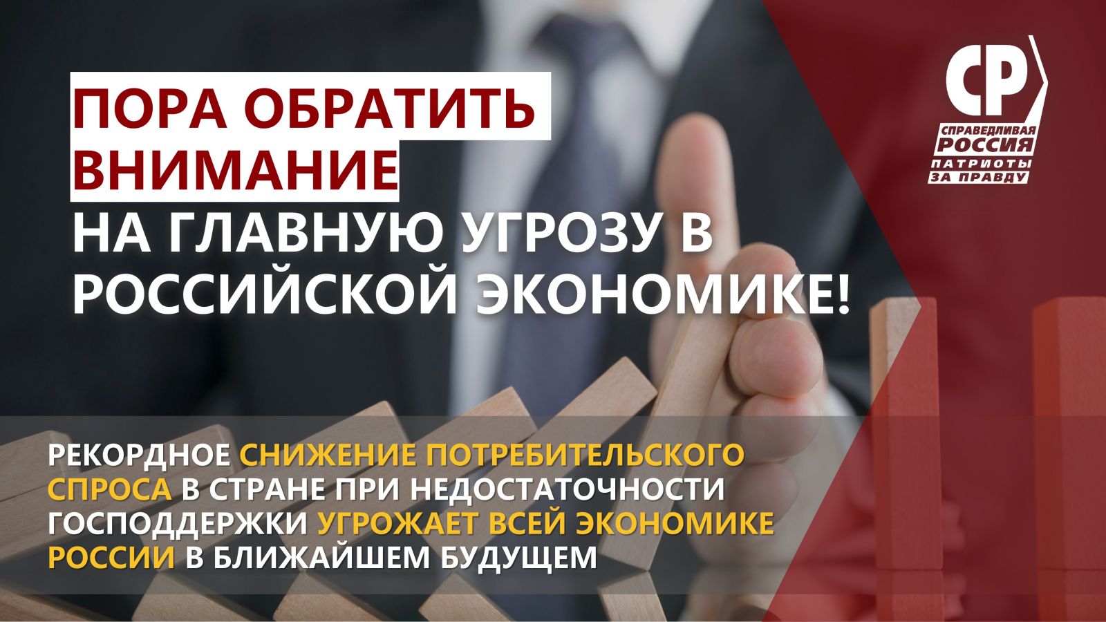 Специалисты партии отвечают: снижение спроса. Экономика любого общества просто перестает работать, если производить товары некуда: если никто не покупает товары, то никто не будет их производить, если никто не тратит деньги, значит, никто их и не зарабатывает. Именно поэтому рекордное снижение потребительского спроса при недостаточности господдержки сейчас угрожает всей экономике страны.