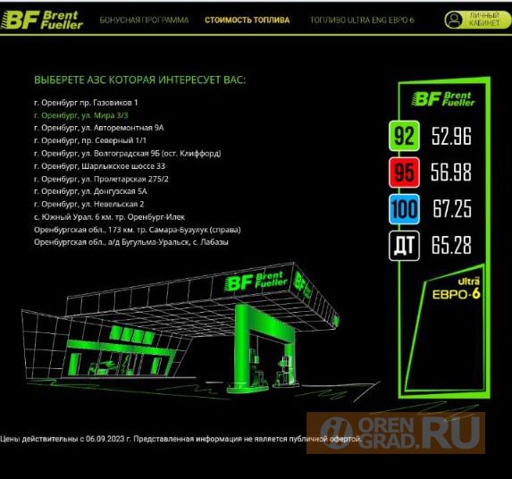 Текст: Александр ЖарковРезкий скачок цен на бензин произошел в Оренбурге, лишь за минувшую ночь на некоторых заправках стоимость бензина выросла на 3 рубля. Так, если Brent Fueller еще 6 сентября на своем официальном сайте представлял действительные цены на топливо, где стоимость АИ-92 составляла 52,96, то уже утром стоимость одного литра этого топлива достигла 55,96, по крайней мере за эту цену предлагает заправиться приложение Яндекс Навигатор.