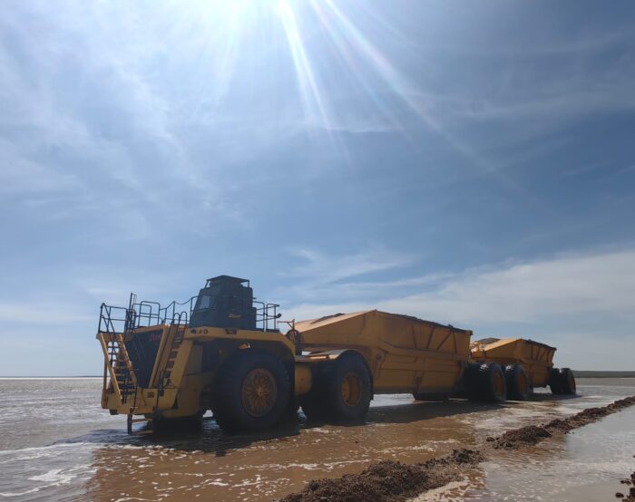 Съемочная группа первым делом отправилась на самый дальний участок озера, где ведет разработку и забор соли новый подборщик, которого местные жители прозвали «Оптимус Прайм». Он введен в эксплуатацию только в 2021 году и позволяет собирать соль с помощью тонкослойной технологии. По данным компании, этот инженерный проект стал не только технологическим прорывом при добыче соли открытым методом на месторождении, но и позволил сделать добычу более щадящей с точки зрения экологии.
