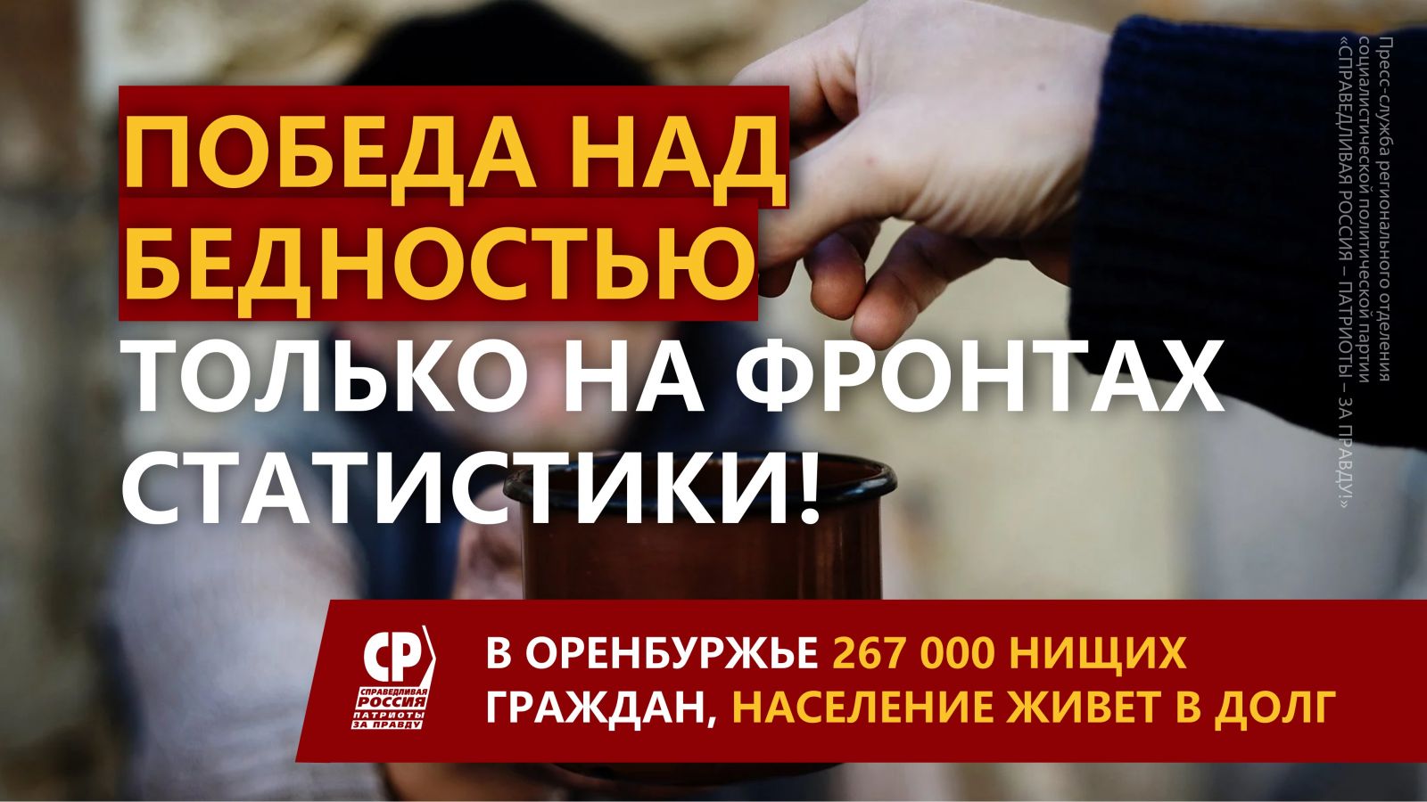 Снижение официальных показателей бедности не соответствует реальной ситуации с благосостоянием граждан. Росстат обнародовал данные об уровне бедности за первый квартал этого года: доля бедных составила 13,5% населения, и только по этим данным в Оренбуржье около 267 000 человек – нищие, при этом граждане уже не считаются бедными, если их доход выше смешных 14027 рублей. Напомним, сегодня средний Оренбуржец должен банкам более 70% своей годовой зарплаты – население закредитовано, живёт в долг и продолжает сокращаться, а недавно Оренбургская область была объявлена социально неблагополучным** регионом.