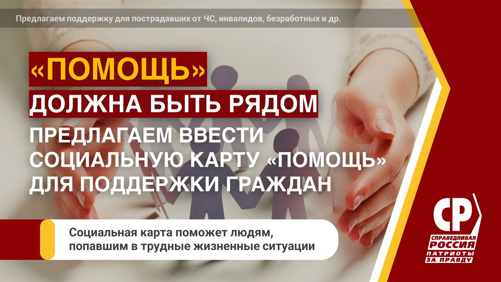 Ранее СПРАВЕДЛИВАЯ РОССИЯ – ЗА ПРАВДУ неоднократно выступала за введение социальной карты для помощи людям в трудной жизненной ситуации, включая пострадавших от чрезвычайных ситуаций, инвалидов, безработных...