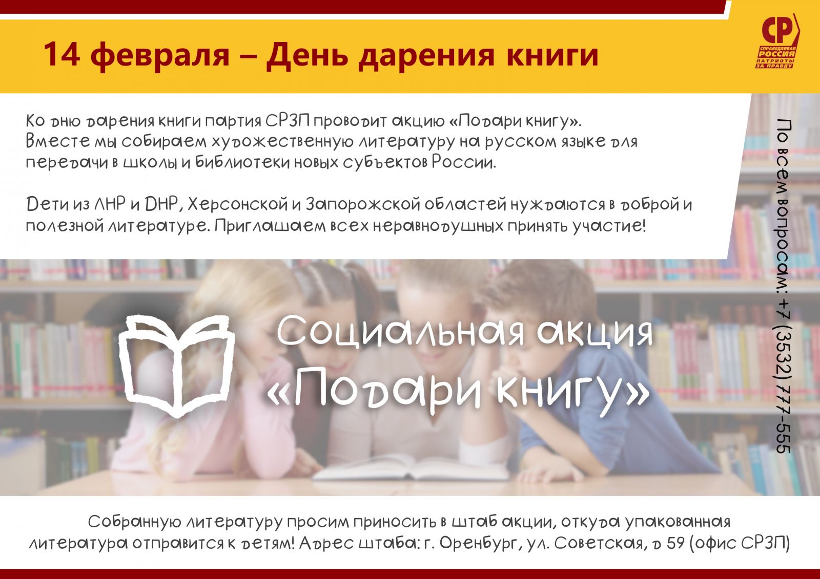 Дети из ЛНР и ДНР, Херсонской и Запорожской областей нуждаются в доброй и полезной литературе. Всех неравнодушных приглашаем принять участие: приносите книги в штаб акции по адресу г. Оренбург, ул Советская 59 – офис партии.