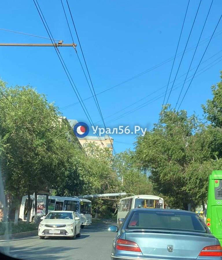 На улице Ленинской в Оренбурге упал столб с троллейбусными проводами. Автомобилисты вынуждены объезжать затор.