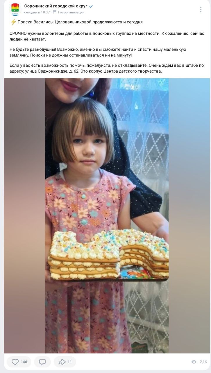 Текст: Александр ЖарковАдминистрация Сорочинского городского округа призывает жителей Оренбургской области оказать помощь в поисках пропавшей Василисы Целовальниковой, пятилетняя девочка пропала 30 июня, когда гуляла возле своего дома.
