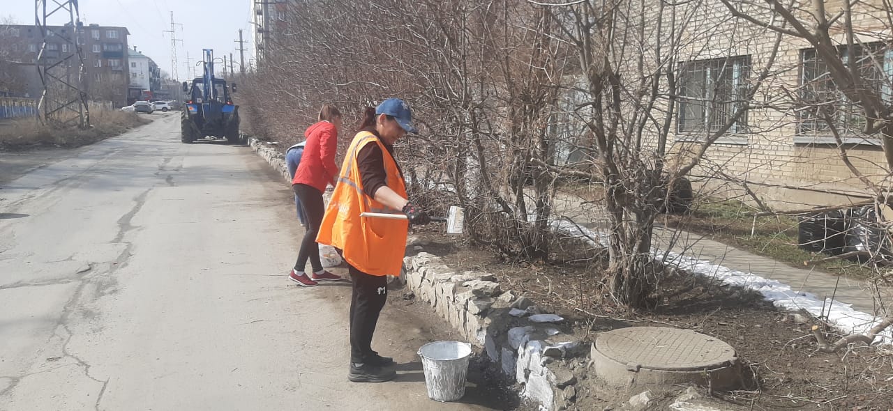 Собрали бытовой мусор, листву, сухие ветки, побелили деревья и клумбы у трамвайного управления.