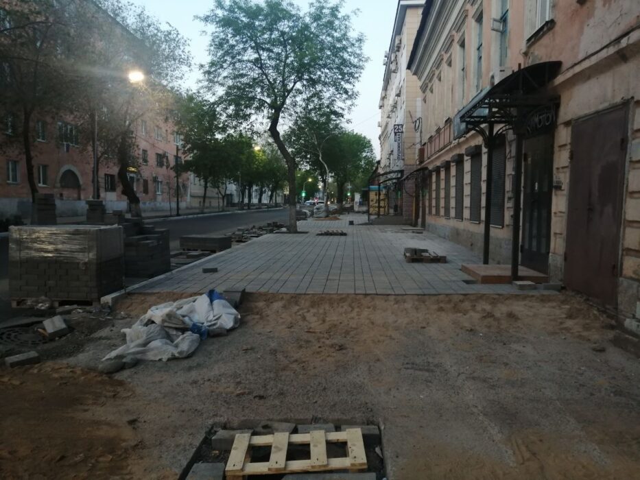 Сейчас ремонт ведется на многих участках, в частности выкладывают плитку на тротуарах вдоль улиц Пушкинской и Чичерина. Ведется ремонт и на улице Советской.