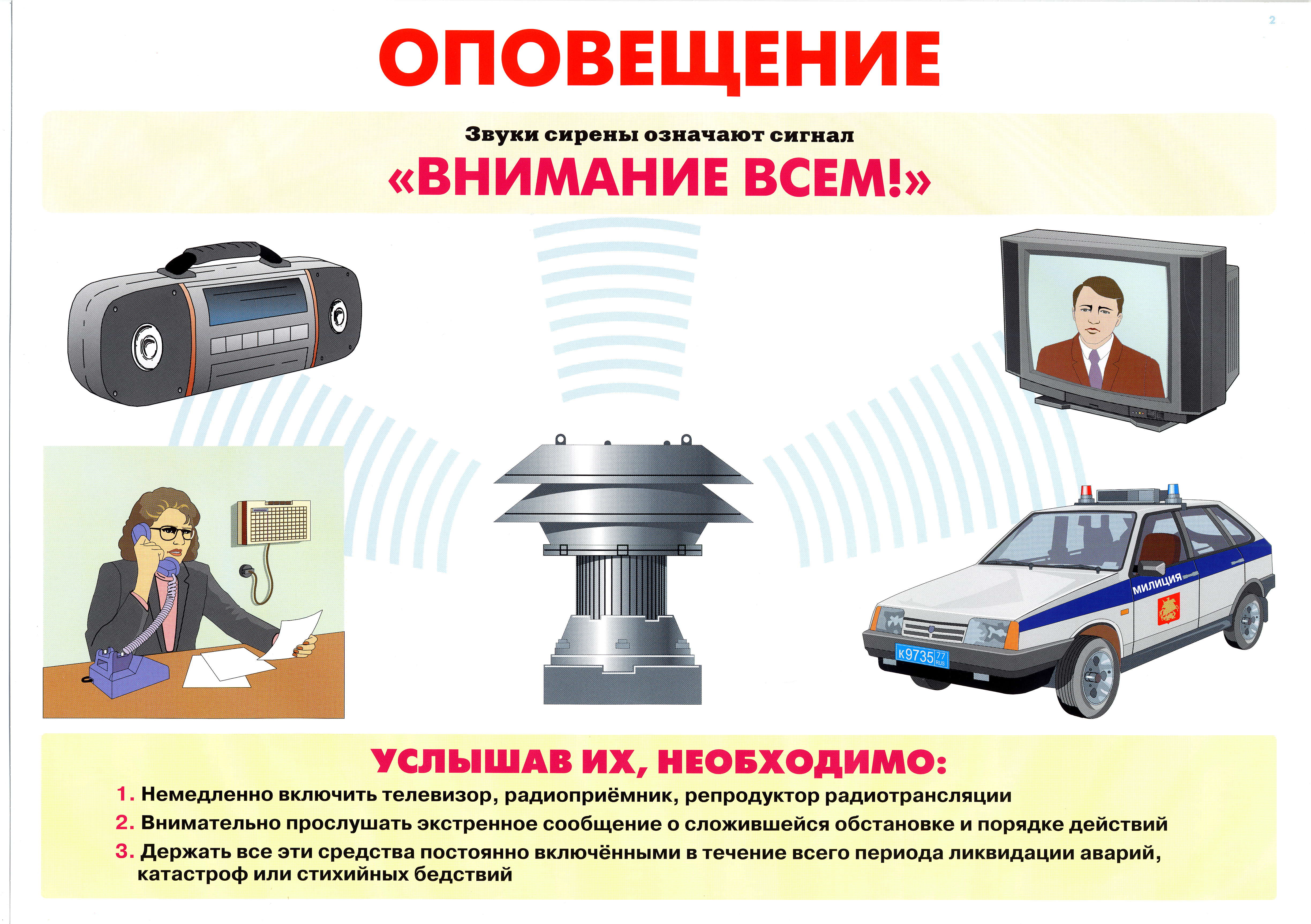 Услышав сигнал, соблюдайте спокойствие. Оставайтесь на рабочих местах или дома и включите радио «Маяк», «Радио Россия», телевизионные приемники на телеканалах «Россия-1, «Россия-24» и прослушайте сообщение.