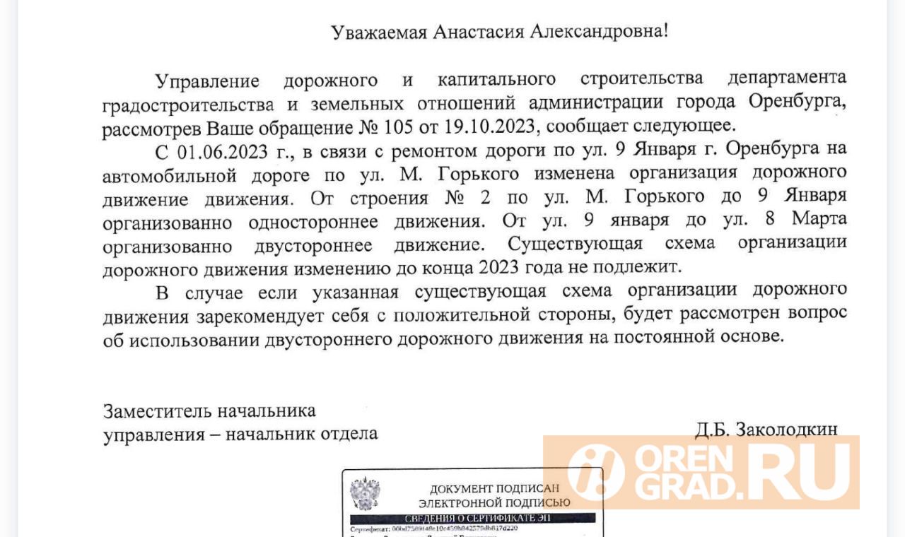 Текст: Александр ЖарковУчасток улицы Максима Горького от переулка Дмитриевского до улицы 9 Января может остаться двусторонним на постоянной основе, об этом журналистам Orengrad сообщили в мэрии Оренбурга. Пока в планах оставить такую схему движения до конца 2023 года.
