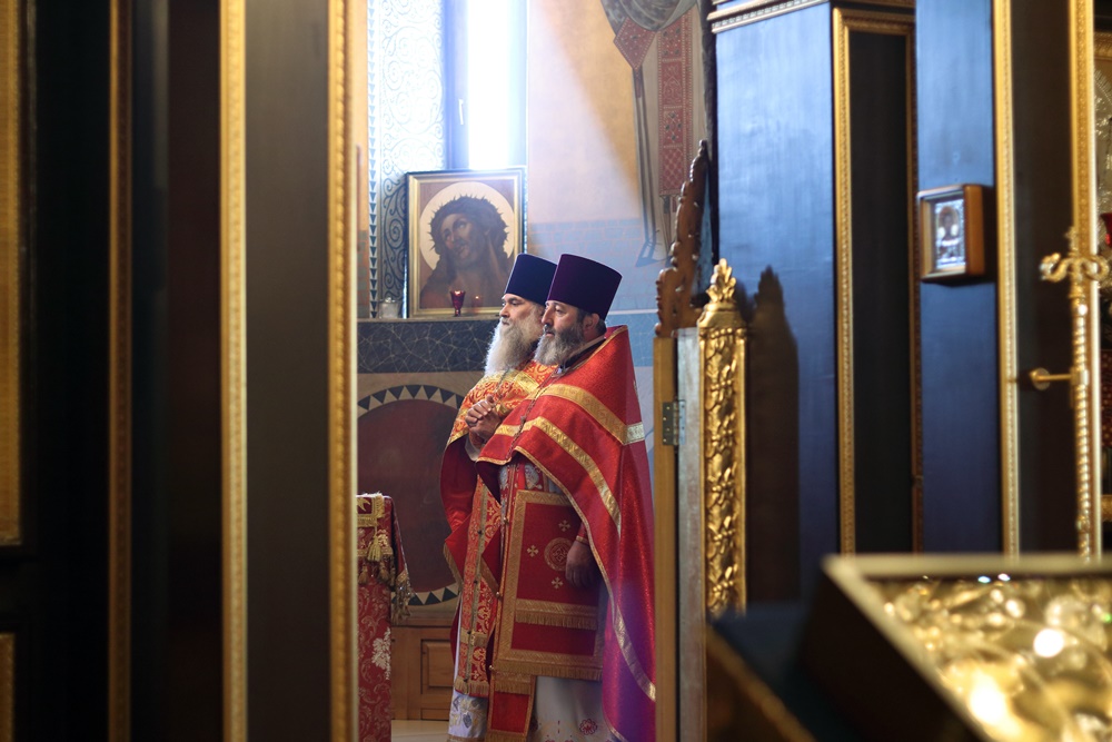 Его Преосвященству сослужили настоятель собора протоиерей Александр Куцов, настоятель храма Покрова Пресвятой Богородицы (бывшего женского монастыря) протоиерей Анатолий Сопига, клирики собора протоиерей Георгий Кожеватов и священник Сергий Куцов, настоятель храма святого Архангела Михаила священник Геннадий Новиков и клирик храма Преображения Господня священник Александр Карпунин.