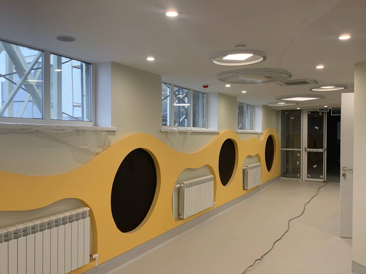 Полностью готов четвертый этаж. Там устанавливают мебель и оборудование. Третий этаж будет полностью сделан к середине октября, первый и второй – до середины ноября. Мебель и оборудование уже закуплены. На улице рабочие занимаются благоустройством — планировкой и вывозом мусора.