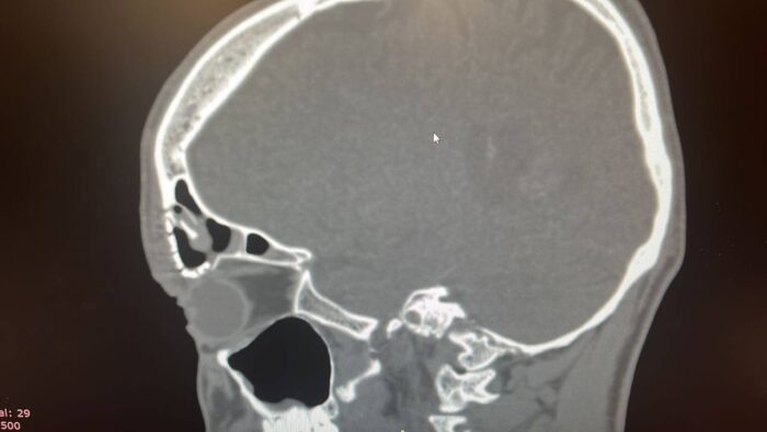 За помощью в оториноларингологическое отделение обратился пациент с переломом передней стенки лобной пазухи после закрытой ЧМТ. Врачи в ходе предоперационного планирования обнаружили серьезные повреждения — значительную линию перелома, вдавление костных отломков в полость пазухи и обширный косметический дефект лобной области.