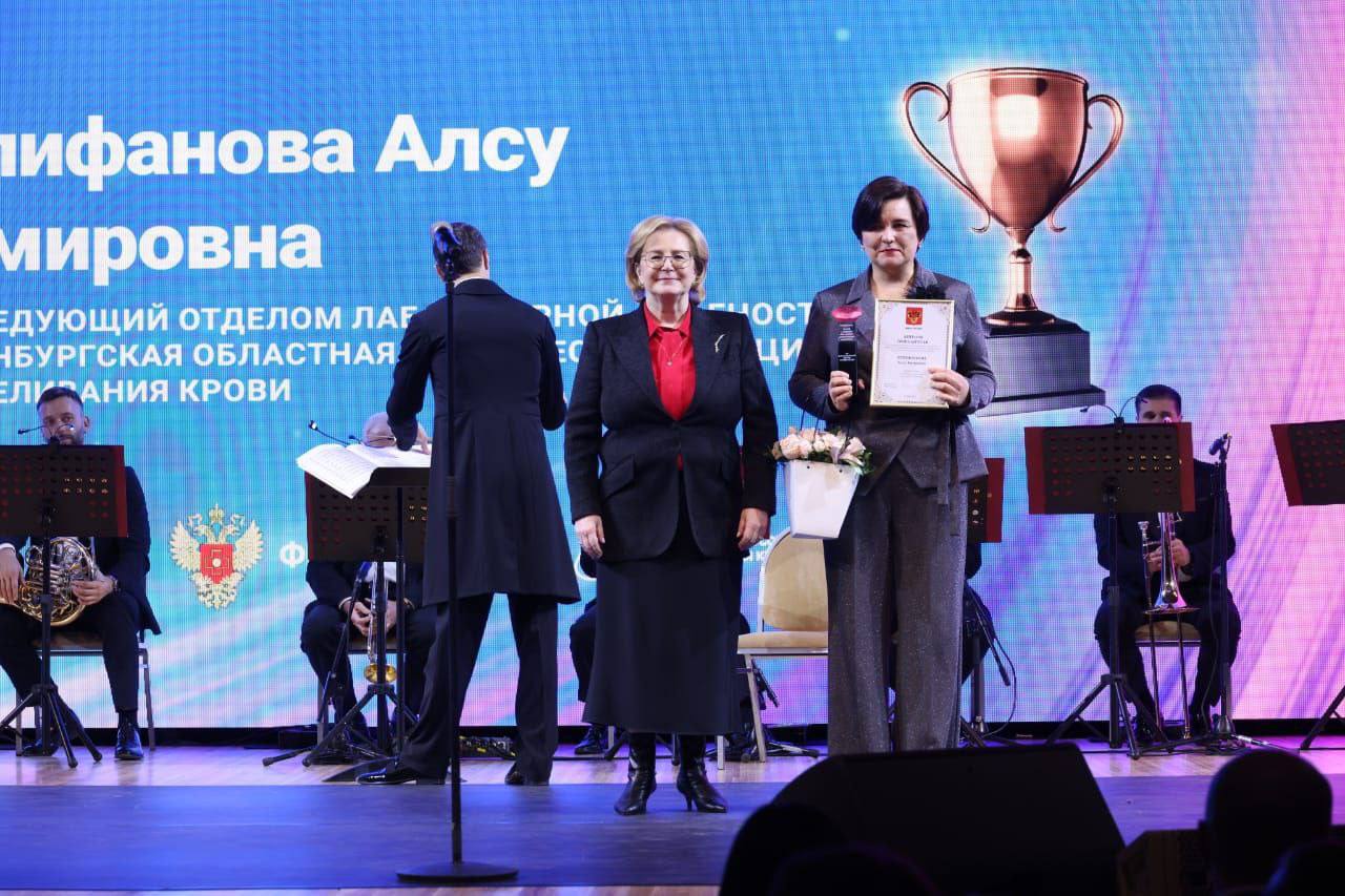 Также были подведены итоги конкурса Всероссийского профессионального мастерства службы крови за 2024 год, на который направлено более тысячи заявок со всей России. Победителем конкурса в номинации «Лучший медицинский работник учреждения службы крови 2024 года» в категории «врач клинической лабораторной диагностики» стала заведующая отделом лабораторной диагностики, врач КЛД Оренбургской областной клинической станции переливания крови, к. м. н. Алсу Епифанова. Награду Алсу Амировне вручала руководитель ФМБА России Вероника Скворцова.